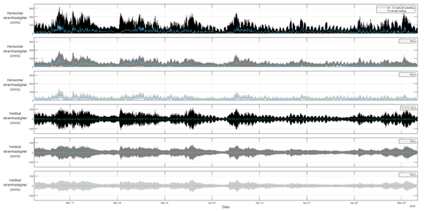 - Horisontale og vertikale strømhastigheter hvert 0,5 sekund i øvre del av vannsøylen