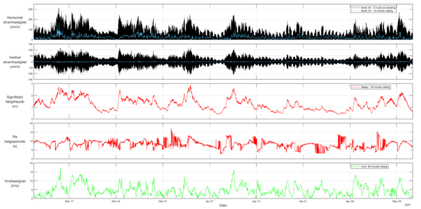 Dette indikerer at anleggene utsettes for raske, sykliske lastvariasjoner drevet av bølgebevegelse – belastninger som i stor grad jevnes ut når data tidsmidles over lengre intervaller.
