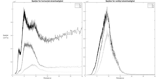 - Vertikale strømmer viste størst energi ved perioder rundt 10 sekunder